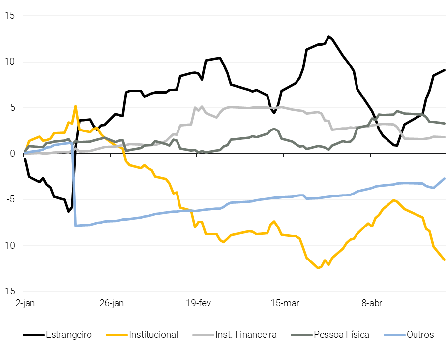 3) Os fluxos seguem dependentes do investidor estrangeiro, uma vez que o varejo permanece cauteloso e os fundos locais continuam a registrar saídas. Estamos menos preocupados com isso com base em nossas conversas recentes em Londres, que mostram que os investidores estrangeiros seguem otimistas com o Brasil (link).
