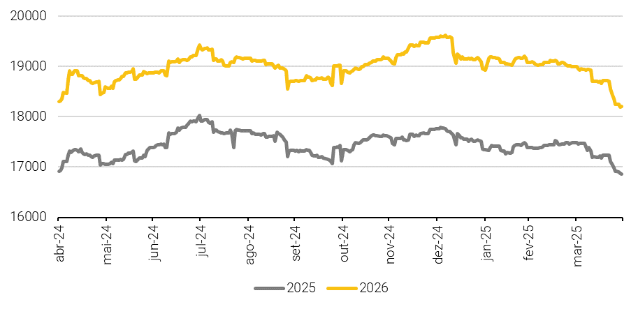 2) A dinâmica de lucros piorou, já que o consenso de lucro por ação do consenso Bloomberg para 2025 e 2026 vem sendo revisado para baixo no Brasil recentemente. Isso se deve em grande parte aos preços das commodities mais baixos, mas vale a pena acompanhar. Com a temporada de resultados se intensificando nas próximas duas semanas, as ações que não atenderem às expectativas podem sofrer no mercado, como visto na temporada do 4º trimestre.