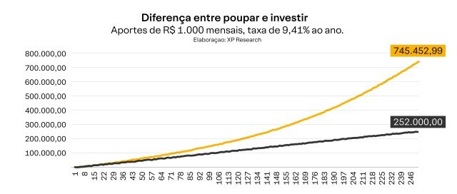 Enquanto uma pessoa guardaria apenas R$ 252.000,00 em 252 meses (sem investir), um investidor já teria acumulado cerca de R$ 745.453,99 no mesmo período, uma diferença de R$ 493.453,99 gerada exclusivamente pelo efeito dos juros compostos.