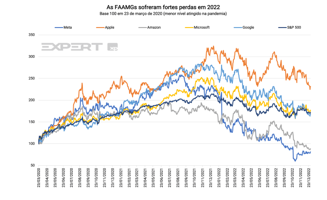 O ano de 2022 foi marcado por fortes quedas nos mercados globais, principalmente das empresas de tecnologia, que são mais sensíveis a alta de juros. Olhando para as FAAMGs, como são conhecidas as maiores empresas de tecnologia nos EUA – Facebook (agora META), Apple, Amazon, Microsoft e Google – elas caíram quase 40% no ano passado juntas. Com essa correção, o valor dessas empresas ficou muito mais atrativo do que um ano atrás.