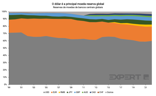 O dólar de fato perdeu um pouco de espaço nas reservas dos bancos centrais globais, passando de 70% em 2000 para os atuais 60%. Ainda assim, é um nível relevante e continua sendo visto como a principal moeda de reserva internacional.