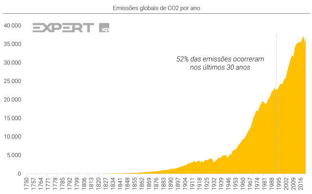 Embora os esforços por parte dos diferentes agentes sejam crescentes, o caminho para o mundo atingir emissões líquidas zero ainda é bastante longo. E mostramos alguns motivos: (i) mais de 52% das emissões totais de CO2 historicamente e em todo o mundo ocorreu a partir de 1990, e tem se intensificado ano após ano¹; e (ii) estima-se que as emissões de GEEs através do consumo de combustíveis fósseis e uso da terra devam atingir o recorde em 2022, alcançando 40,6 GtCO2 (bilhões de toneladas de CO2) globalmente².