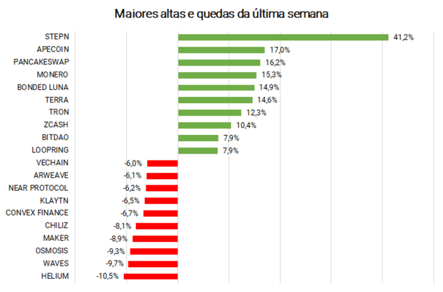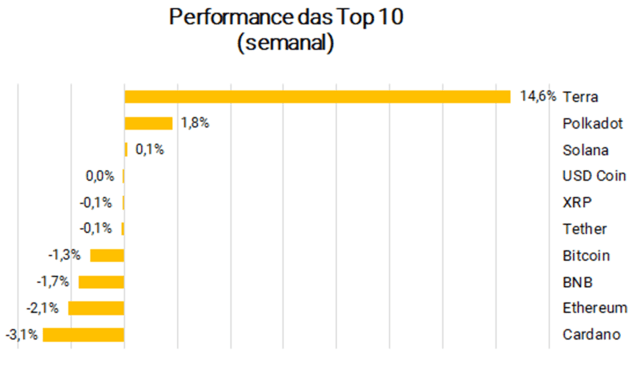 Semana de leves perdas para os criptoativos. No agregado, o valor das criptomoedas retornou para US$ 1,94tri, uma queda de -2,1% vs. a semana anterior.