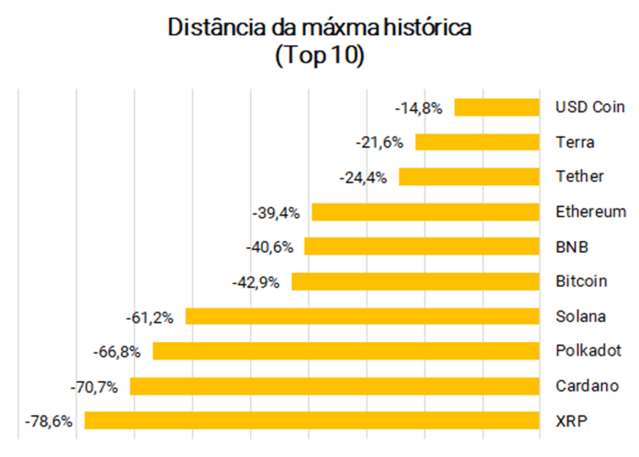 O gráfico acima mede o nível da correção atual no preço das maiores criptomoedas vs. a sua máxima histórica. Segundo os dados, apesar da recuperação recente, grande parte das moedas ainda se encontram em bear market após o período de forte correção que não só impactou as cotações, como também contribuiu para uma redução no volume de negociações das moedas.