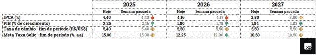 • Quedas marginais nas projeções para o IPCA. A mediana das projeções para o IPCA deste ano caiu de 4,43% para 4,40%, e, para 2026, de 4,17% para 4,16%. O mercado continua a projetar IPCA em 3,80% para 2027. A inflação corrente e as expectativas permanecem elevadas para este o próximo ano, a despeito dos recentes sinais de alívio. A queda adicional da inflação rumo à meta tende a ser mais difícil, dada a desaceleração apenas gradual da atividade econômica e o mercado de trabalho aquecido.