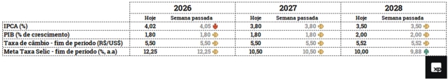 • Taxa de câmbio sem alterações. As projeções para 2026 e 2027 seguem indicando R$/US$ 5,50. A retomada do ciclo de cortes de juros pelo banco central dos Estados Unidos contribui para a acomodação das moedas emergentes, como o real. Para 2028, sem grandes alterações, a mediana das projeções indica R$/US$ 5,52.