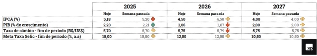 • Projeções de inflação para 2025 seguem recuando. A mediana das projeções para o IPCA de 2025 caiu pela 6ª semana consecutiva, de 5,20% para 5,18%, refletindo a apreciação da taxa de câmbio e dinâmica benigna de preços no atacado, tanto para alimentos quanto para industrializados. Para 2026 e 2027, as expectativas estabilizaram em 4,50% e 4,00%, respectivamente. Apesar da melhora na margem, o consenso de mercado segue consideravelmente acima da meta de 3,00% para todo o horizonte relevante.