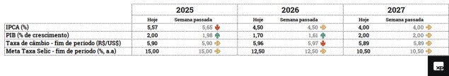 • Taxa de câmbio estável em 2025. A expectativa para a taxa de câmbio ao final de 2025 e 2027 permaneceu em R$/US$ 5,90 e R$/US$ 5,89, respectivamente. Para 2026, a taxa de câmbio cedeu ligeiramente de R$/US$ 5,97 para R$/US$ 5,96.