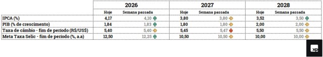 • Taxa Selic retorna para 12,50% neste ano. A mediana das previsões para a taxa básica de juros de 2026 avançou de 12,25% para 12,50%, registrando a 2ª semana consecutiva de alta, em linha com a percepção de menor espaço para cortes. Para os anos seguintes, o mercado projeta taxa Selic de 10,50% em 2027 e 10,00% em 2028. Em nosso cenário, antecipamos que a Selic deve encerrar 2026 em 12,75%. No curto prazo, a inflação tem mostrado desaceleração, embora com leve piora nas últimas leituras. Por outro lado, as expectativas seguem distantes da meta de 3,0% no médio prazo. A alta do petróleo permanece como um risco inflacionário relevante.