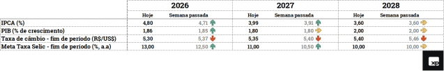 • Ciclo de cortes menor. A mediana das expectativas para a taxa básica indica Selic em 13,00% ao final de 2026, acima da projeção da semana passada, quando o mercado esperava 12,50%. A expectativa para o fim de 2027 também foi revisada para cima, de 10,50% para 11,00%. O atual choque de oferta, marcado pela elevação dos custos de produção, somado à atividade doméstica ainda aquecida, tende a exigir uma postura mais cautelosa da política monetária. Na prática, isso significa um ritmo de flexibilização mais lento ao longo do ano em comparação ao cenário vigente antes do conflito no Oriente Médio.