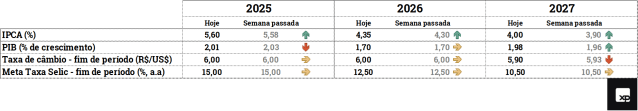 • Taxa de câmbio sem alterações. As expectativas de mercado para a taxa de câmbio seguem em R$/US$ 6,00 para o final de 2025 e 2026.
