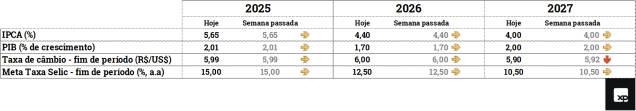• Taxa de câmbio sem mudanças. As expectativas de mercado para a taxa de câmbio se mantiveram em R$/US$ 5,99 para o final de 2025 e R$/US$ 6,00 para o final de 2026.
