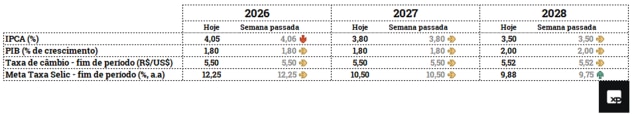 • Taxa de câmbio sem alterações. As projeções para 2026 e 2027 seguem indicando R$/US$ 5,50. A retomada do ciclo de cortes de juros pelo banco central dos Estados Unidos contribui para a acomodação das moedas emergentes, como o real. Para 2028, sem grandes alterações, a mediana das projeções indica R$/US$ 5,52.