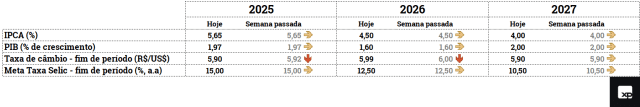• Taxa de câmbio mais apreciada em 2025. A expectativa para a taxa de câmbio ao final de 2025 cedeu de R$/US$ 5,92 para R$/US$ 5,90, enquanto que para 2026, a taxa de câmbio cedeu ligeiramente de R$/US$ 6,00 para R$/US$ 5,99. Para 2027, as projeções se mantiveram em R$/US$ 5,90.