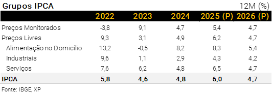Tudo considerado, o recuo em nossa projeção de bens industrializados foi compensado pela adoção da premissa de “bandeira amarela” nas tarifas de energia elétrica. Além disso, a revisão que fizemos para o PIB (veja na seção de Atividade) implicaria alta na inflação, que foi virtualmente compensada pela surpresa baixista que tivemos nas últimas leituras do IPCA. Reconhecendo riscos relacionados à dinâmica cambial, mantivemos a projeção de alta de 6,0% para o IPCA de 2025.