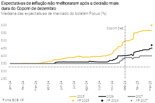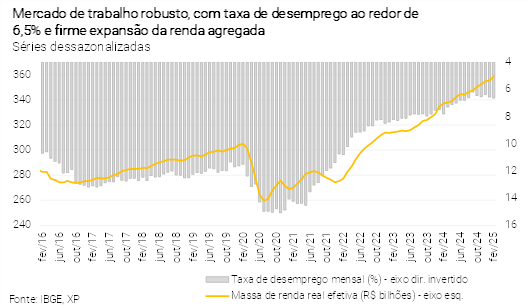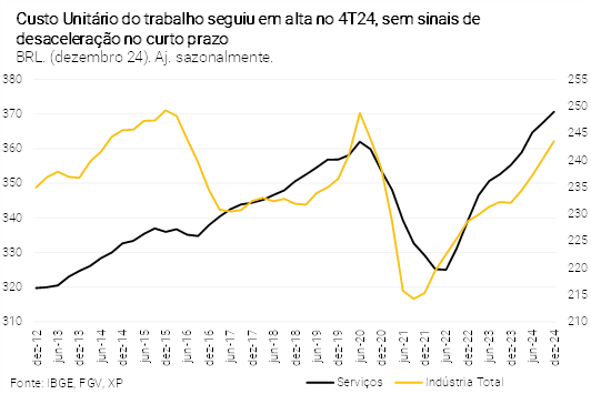 Inflação de serviços sem indícios de inflexão no curto prazo. Projetamos aumento na inflação de serviços ao longo do ano, mesmo diante de algum arrefecimento da atividade econômica. O mercado de trabalho mostra dinamismo acima do esperado, com dados de fevereiro mostrando solidez na geração de empregos formais e na evolução dos salários. Isso tende a pressionar os custos das empresas, que são parcial ou totalmente repassados aos preços finais. Sobre o tema, escrevemos um relatório especial mostrando que o Custo Unitário do Trabalho (CUT) (documento em inglês) continuou em trajetória de alta no 4º trimestre de 2024 – e não há sinais de alívio no curto prazo.