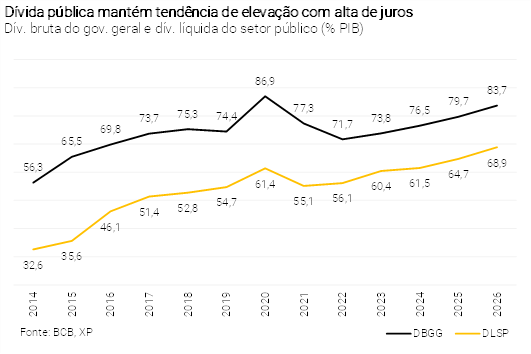 Sem mudanças na tendência para a dívida pública. Avaliamos que a atual composição da dívida pública, com elevada participação de títulos pós-fixados, deve resultar em aumento do custo implícito no curto prazo. Portanto, avaliamos que a tendência de alta da dívida permanece, com a relação entre Dívida Bruta do Governo Geral (DBGG) e PIB atingindo 79,7% em 2025 e 83,7% em 2026. A Dívida Líquida do Setor Público (DLSP), por sua vez, deve atingir 64,7% do PIB no final de 2025 e 68,3% do PIB no final de 2026.