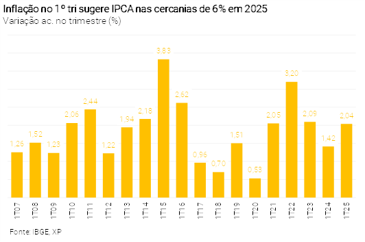 - Reduzimos nossa projeção para a inflação de bens industrializados neste ano, em linha com a apreciação cambial no 1T25. Porém, assumimos agora “bandeira amarela” nas tarifas de energia elétrica em dezembro. Logo, nossa projeção para o IPCA de 2025 segue em 6,0%. Nossa expectativa para 2026 subiu de 4,5% para 4,7%, devido ao impacto da reforma do Imposto de Renda.