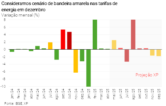 “Bandeira amarela” em dezembro. Diante das condições hidrológicas menos favoráveis, optamos por adotar a premissa de “bandeira amarela” nas tarifas de energia elétrica em dezembro, com impacto de 0,1 p.p. no IPCA de 2025. Desse modo, consideramos ao longo do ano: “bandeira amarela” em maio; “vermelha 1” em junho; “vermelha 2” entre julho e setembro; “vermelha 1” em outubro; “amarela” em novembro e dezembro. Atualizaremos nossas projeções mensalmente, refletindo as novas informações de clima e do setor elétrico. Para 2026, consideramos a premissa de “bandeira amarela” em dezembro, sem alterar (por essa via) nossa projeção de inflação.
