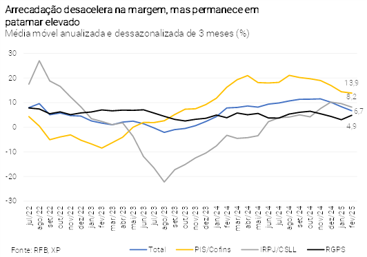 Desaceleração gradual da arrecadação tributária. A receita líquida cresceu apenas 3,1% em fevereiro de 2025 comparado a fevereiro de 2024 (em termos reais), após aumento de 3,7% em janeiro e 9,0% em 2024. A desaceleração, pelo menos nesta intensidade, já era esperada devido ao arrefecimento da atividade – e não preocupa. As despesas, por outro lado, cresceram 3,3% em fevereiro quando excluídos os precatórios, com destaque para a elevação nas contas de benefícios previdenciários e assistenciais. No agregado, o resultado primário do 1º bimestre ficou positivo em R$ 53,2 bilhões, dando algum espaço ao governo no restante do ano.