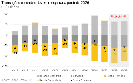 Para 2026, não projetamos piora adicional nas transações correntes. Esperamos déficit de US$ 57,0 bilhões (2,6% do PIB) para as transações correntes em 2026, na esteira da desaceleração da demanda doméstica.