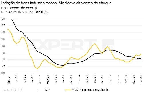 Maior pressão na inflação de bens industrializados. Projetamos elevação anual de 3,2% para o grupo, contra 2,1% antes do conflito no Oriente Médio. Além dos preços de etanol mais altos (refletindo o novo cenário para a gasolina), esperamos aumento em produtos químicos, eletroeletrônicos, vestuário e subitens de higiene pessoal. A taxa de câmbio segue relativamente bem-comportada, amortecendo esses efeitos. Ademais, nossas projeções incorporam elevação nos custos de chips e componentes eletrônicos, além da recente alta do IPI sobre cigarros (0,07 p.p. sobre o IPCA de 2026).