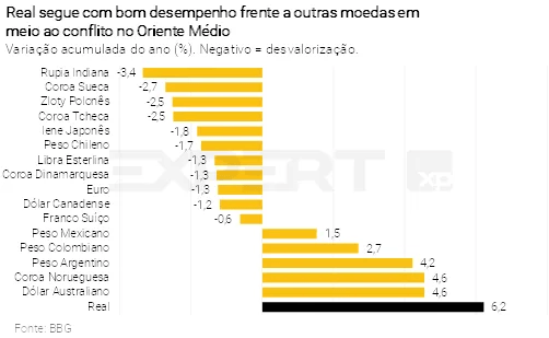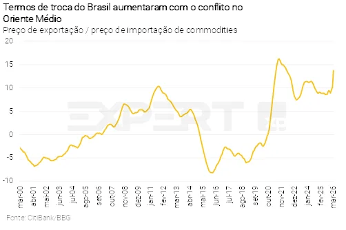 Pelo lado positivo, os preços do petróleo mais elevados impulsionam a balança comercial brasileira — elevamos nossa projeção de US$ 54,0 bilhões para US$ 76,5 bilhões em 2026 — e as receitas fiscais. Nesse contexto, o real tem apresentado desempenho superior ao de seus pares (6% de valorização no acumulado do ano). Ajustamos nossa projeção para a taxa de câmbio para 5,30 reais por dólar ao final do ano (5,60 anteriormente), o que deve mitigar parte das pressões inflacionárias recentes.