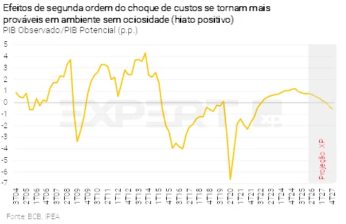 Choques de oferta são mais preocupantes para a inflação em contexto de baixa capacidade ociosa. Diante de um choque de oferta (aumento de custos de produção), a literatura econômica recomenda que os bancos centrais acomodem o efeito inflacionário primário e combatam os efeitos secundários — isto é, repasses para os preços de itens não diretamente afetados pelo choque. O cenário atual de baixa capacidade ociosa na economia brasileira (hiato do produto positivo) aumenta a probabilidade de materialização desses efeitos secundários, demandando resposta da política monetária.