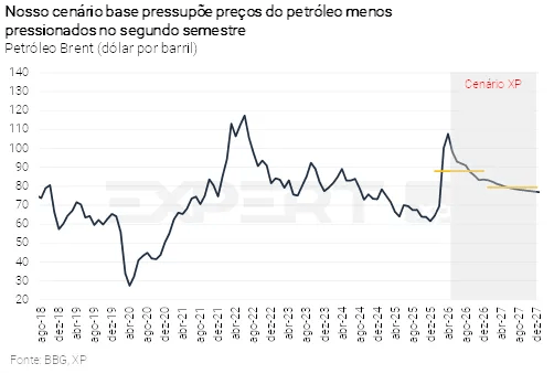 Assim, revisamos nossa hipótese para a cotação do petróleo Brent de US$ 60 para US$ 90 por barril em 2026 (média anual) e US$ 80 em 2027.