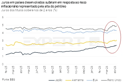 O choque do petróleo coloca os bancos centrais em uma posição difícil. Inicialmente, a reação dos mercados consistiu na elevação das taxas de juros futuras tanto em economias desenvolvidas quanto emergentes. No entanto, o risco de recessão provocado pela crise limita a possibilidade de uma postura muito contracionista dos bancos centrais. De todo modo, parece correto incorporar juros globais mais elevados ao nosso cenário-base para o Brasil. Por exemplo, não esperamos novos cortes de juros por parte do Federal Reserve (banco central dos EUA) no horizonte projetável.