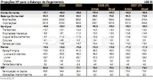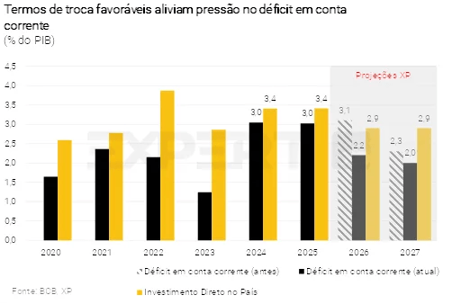 Déficit em conta corrente mais baixo. A elevação nos custos com fretes piorou o déficit da conta de serviços, mas não o suficiente para compensar o aumento nas exportações. Logo, nossa expectativa para o déficit em conta corrente de 2026 diminuiu de US$ 78,4 bilhões (3,1% do PIB) para US$ 58,0 bilhões (2,2% do PIB).