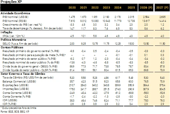 Mantemos a projeção de 4,0% em 2027. Tudo o mais constante, a recente revisão na projeção para o IPCA de 2026 (de 3,8% para 4,8%) implicaria uma inércia de 0,3 p.p. para 2027. Contudo, esse efeito é compensado em nosso cenário devido a: i) uma premissa de queda nos preços do petróleo, com a média passando de US$ 90 por barril este ano para US$ 80 por barril no ano que vem; e ii) um ciclo menor de cortes de juros pelo Banco Central em 2026. Outro fator chave para a inflação do ano que vem é a perspectiva de reformas fiscais, e seus efeitos sobre prêmios de risco e expectativas.