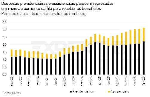 Relatório bimestral traz bloqueio insuficiente. A revisão das despesas com benefícios previdenciários e BPC/LOAS foram mínimas e não incluíram os efeitos da redução nas filas de pedidos de benefícios, que chegaram a 3,1 milhões em fevereiro. Dessa forma, ainda vemos a necessidade de um bloqueio adicional de despesas de (no mínimo) R$ 6,0 bilhões para o cumprimento do limite de gastos.