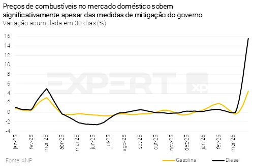 No caso do diesel (0,2% do IPCA), diversas medidas de mitigação têm sido anunciadas pelo governo, mas ainda sem efeito claro sobre os preços ao consumidor, que se elevaram significativamente desde o início do conflito. O impacto direto sobre o IPCA é pequeno, mas os efeitos indiretos — via fretes e outros custos — são relevantes. Acreditamos que a alta contratada no curto prazo persistirá ao longo do ano (prevemos 23% em 2026). Por fim, não esperamos aumento expressivo nos preços do gás de botijão (4,2% este ano), dado que elevações nesse item são politicamente sensíveis. O governo já anunciou medidas para mitigar reajustes.