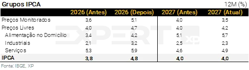 Inflação de serviços deve encerrar 2026 em 5,9%, praticamente o mesmo resultado de 2025. Neste grupo, destaque para as revisões altistas nas expectativas de passagens aéreas e alimentação fora do domicílio. O preço do querosene de aviação será reajustado pela Petrobras ao longo de 2026 (em torno de 50%), de forma parcelada. Para o grupo de serviços subjacentes, que excluem componentes mais voláteis como passagens aéreas, projetamos variação anual de 5,8%.
