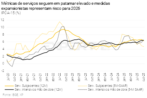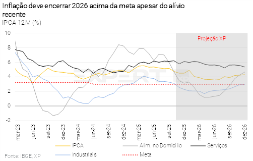 Sem alívio significativo para preços de serviços nos próximos trimestres. A inflação de serviços também arrefeceu nos últimos meses, por conta de fatores pontuais – seguro voluntário de veículo, por exemplo – e pela queda nos preços de alimentos, que beneficiaram o de item alimentação fora do domicílio (aproximadamente 30% da métrica de serviços subjacentes, acompanhada de perto pelo banco central). Vemos espaço limitado para desinflação adicional desse grupo, uma vez que: i) o mercado de trabalho continuará aquecido, especialmente diante de estímulos à demanda agregada em ano eleitoral; e ii) as expectativas de inflação não devem ceder muito além dos patamares atuais, por conta dos riscos fiscais. Assim, projetamos que a inflação de serviços encerrará 2025 em 6,1%, cedendo para 5,3% em 2026 – ou seja, nível ainda muito acima da meta de 3,0%.