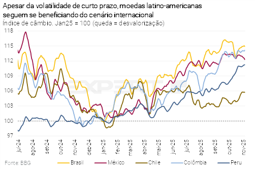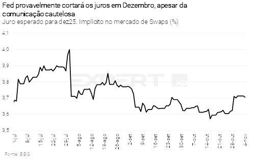 O Fed pode frustrar a expectativa dos mercados. Os indicadores de atividade nos EUA não sinalizam uma desaceleração contundente, e a inflação continua acima da meta. O shutdown tem dificultado essa leitura, devido a ausência de dados econômicos relevantes. Assim, o Fed pode desapontar as apostas mais otimistas sobre a continuidade da redução dos juros, como sugeriu o presidente do Fed, Jerome Powell, na última coletiva após a decisão de política monetária. Isso poderia implicar alguma valorização do dólar, pressionando moedas emergentes.