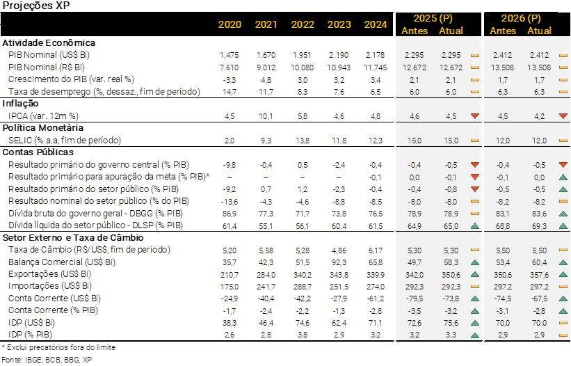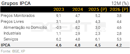 Com base nos fatores discutidos acima, reduzimos sutilmente nossa projeção para o IPCA de 2025, de 4,6% para 4,5%. Para 2026, nossa projeção recuou de 4,5% para 4,2%.