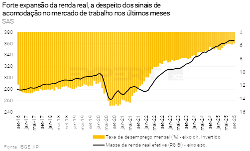 Alta expressiva da renda, apesar dos sinais iniciais de estabilização no mercado de trabalho. A população ocupada perdeu tração nos últimos meses, especialmente as categorias sem carteira assinada. Ainda assim, a taxa de desemprego continua nas mínimas históricas, entre 5,5% e 6,0%. No contexto de mercado de trabalho apertado, a massa de rendimentos reais deve crescer ao redor de 5,5% em 2025, consideravelmente acima das projeções iniciais (cerca de 4,0% no começo do ano). Essa dinâmica tem mantido o setor de serviços em trajetória de alta, embora a um ritmo mais moderado.