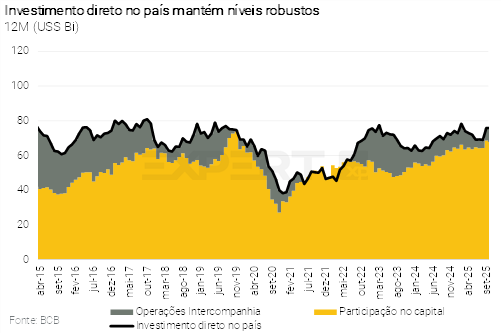 Aumentamos também a expectativa de Investimento Direto no País (IDP). Nossa projeção para os fluxos líquidos de IDP incorporou a surpresa altista com os dados de setembro. Consideramos este resultado mais forte como pontual, uma vez que ele foi explicado, em grande medida, por uma operação extraordinária acima de US$ 1 bilhão. Dito isso, o IDP vem mostrando números robustos este ano. Destacamos o aumento na conta de participação no capital. Elevamos nossa projeção de IDP de US$ 72,6 bilhões (3,2% do PIB) para US$ 75,6 bilhões (3,3% do PIB) em 2025. A projeção para 2026 permaneceu em US$ 70,0 bilhões (2,9% do PIB).