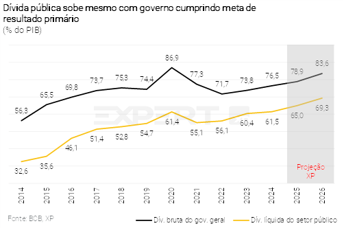 - O governo deve cumprir a meta de resultado primário neste ano e, com o auxílio de receitas extraordinárias, ficar próximo do limite inferior no ano que vem. No entanto, a dívida pública continuará em alta, atingindo 83,6% do PIB em 2026.