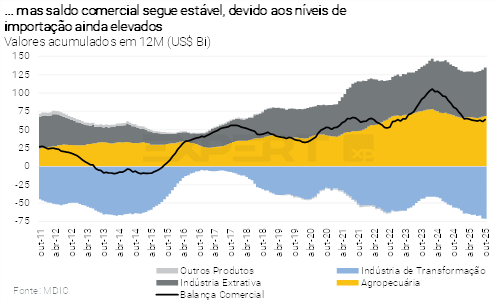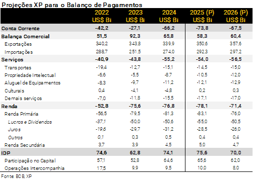 Para o ano que vem, as perspectivas para a produção agrícola são positivas. Além disso, o novo terminal de Santos e a retomada de um terminal em Barcarena aumentarão a capacidade de exportação de soja. Por outro lado, medidas de estímulo à atividade econômica podem significar desempenho mais forte das importações, e o excesso de oferta de algumas commodities pode pressionar os preços exportados (ver seção ‘Pano de Fundo Global’). Ajustamos nossa projeção para a balança comercial de 2026 de US$ 62,0 bilhões para US$ 69,0 bilhões.
