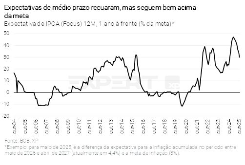 No Brasil, a desaceleração da economia está mais evidente, refletindo os efeitos da política monetária restritiva. A inflação continua em queda, beneficiada pela valorização do real, recuo nos preços da gasolina, condições climáticas favoráveis e robusta produção de alimentos. As expectativas de inflação vêm caindo de forma gradual e consistente — sinal de que a persistência do Banco Central tem surtido efeito. O espaço para um ciclo de flexibilização monetária no próximo ano tornou-se mais claro, movimento refletido na queda dos juros futuros.