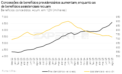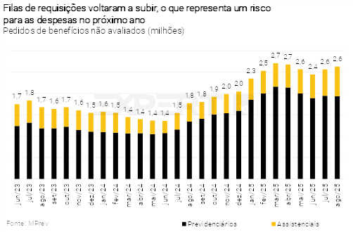 Elevação do limite de despesas reduz pressão em 2026. O aumento do limite de despesas em R$ 13,4 bilhões decorrente da PEC 66/2023 permitirá uma execução orçamentária com menor pressão no próximo ano. No entanto, os riscos para as despesas com benefícios previdenciários e BPC/LOAS estão inclinados para cima, tendo em vista que as filas de pedidos de benefícios continuam em patamares próximos da máxima histórica. Sua reversão teria impacto significativo no próximo exercício.