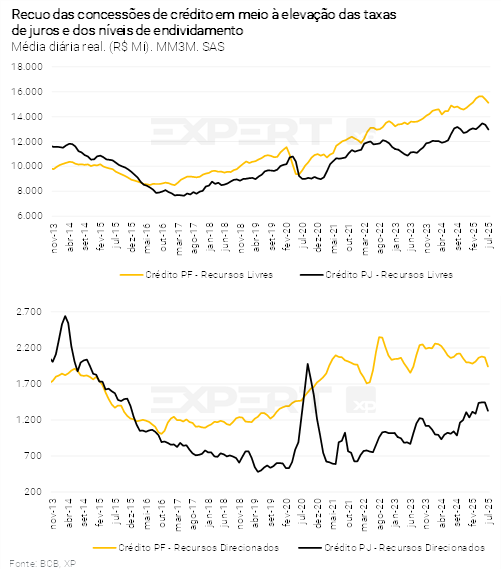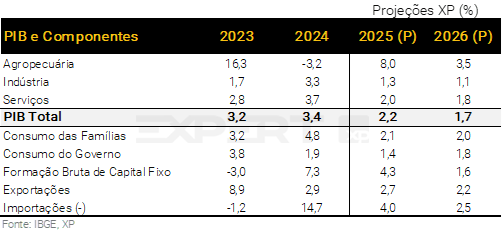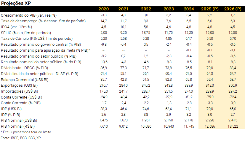 - Em relação à atividade econômica, o cenário de desaceleração (heterogênea entre os setores) está mais evidente. Portanto, continuamos a projetar que o PIB crescerá 2,2% em 2025 e 1,7% em 2026.