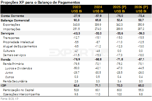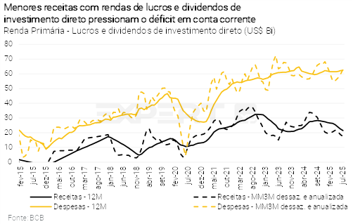 Superávit comercial menor e déficit em renda primária maior pressionam o resultado em conta corrente este ano. Em janeiro, nossa projeção para o déficit em conta corrente de 2025 se encontrava em US$ 52,5 bilhões (2,6% do PIB). Desde então, além da piora no saldo comercial, menores receitas com lucros e dividendos de investimento direto – na conta de renda primária – também pressionaram o déficit em transações correntes. Esta tendência ocorre desde o início do ano (evidente após a revisão ordinária nos dados de junho) e deve persistir ao longo desse semestre, o que nos levou a reduzir marginalmente nossa projeção para a renda primária em US$ 1,5 bilhão em 2025 e US$ 3,0 bilhões em 2026. Consequentemente, nossa projeção de déficit em conta corrente de 2025 foi elevada de US$ 73,5 bilhões (3,1% do PIB) para US$ 75,0 bilhões (3,3% do PIB); para 2026, de US$ 69,4 bilhões (2,9% do PIB) para US$ 72,4 bilhões (3,0% do PIB).