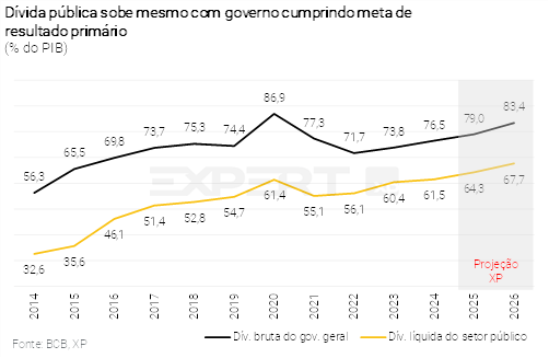 Apesar de cumprir metas, governo não conseguirá estabilizar a dívida. Projetamos que a Dívida Bruta do Governo Geral (DBGG) atingirá 79,0% do PIB e 83,4% do PIB ao final de 2025 e 2026, respectivamente. Já a Dívida Líquida do Setor Público (DLSP) deve alcançar 64,3% do PIB e 67,7% do PIB. Em ambos os casos, a tendência é altista, refletindo o alto custo implícito da dívida pública, que levou o país a registrar em junho o maior déficit nominal desde 2020.