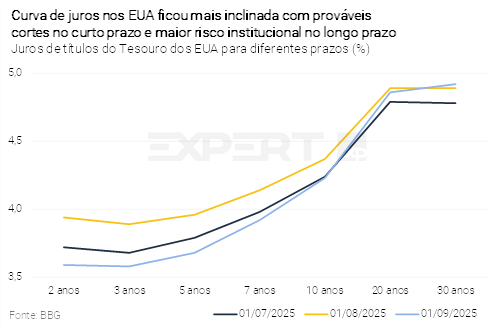 Cortes do Fed: de “no máximo” para “pelo menos”. Até a revisão recente nos dados de criação de ocupações nos EUA, o mercado enxergava no máximo dois cortes na taxa de juros em 2025. Após constatar que o mercado de trabalho estava mais fraco do que se acreditava, e depois do discurso menos preocupado do Presidente do Fed, Jerome Powell, a maior parte dos analistas passou a antecipar pelo menos dois cortes este ano, seguidos por reduções adicionais no ano que vem. Trata-se de um movimento positivo para países emergentes – e para o Brasil em particular.