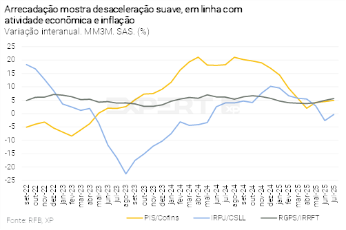 Governo central acumula déficit de R$ 70,3 bilhões no ano. O pagamento de precatórios em julho levou o governo central a registrar déficit de R$ 59,1 bilhões, o pior desde 2020. Apesar do resultado, a leitura trouxe sinais positivos. A receita mantém crescimento sólido, ainda que com sinais de desaceleração. As despesas obrigatórias continuam pressionando o limite de despesas, porém a execução mais fraca de discricionárias garante algum alívio. Dessa forma, esperamos melhora no resultado primário nos próximos meses.