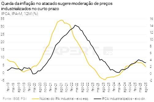Preços de bens industrializados seguirão bem-comportados neste e no próximo ano. A apreciação cambial do primeiro semestre continua aliviando a pressão sobre os preços de bens duráveis e semiduráveis, ainda que em menor intensidade. Os preços de importação permanecem em território negativo, refletindo os impactos secundários da “guerra comercial” entre Estados Unidos e as demais nações. Além disso, confirmou-se o cenário de redução nos preços de automóveis, na esteira da queda do IPI implementada pelo governo. Olhando para 2026, a inflação do grupo deverá seguir bem-comportada, abaixo da média histórica, segundo nossa premissa de alta moderada dos preços de commodities e da taxa de câmbio nominal.